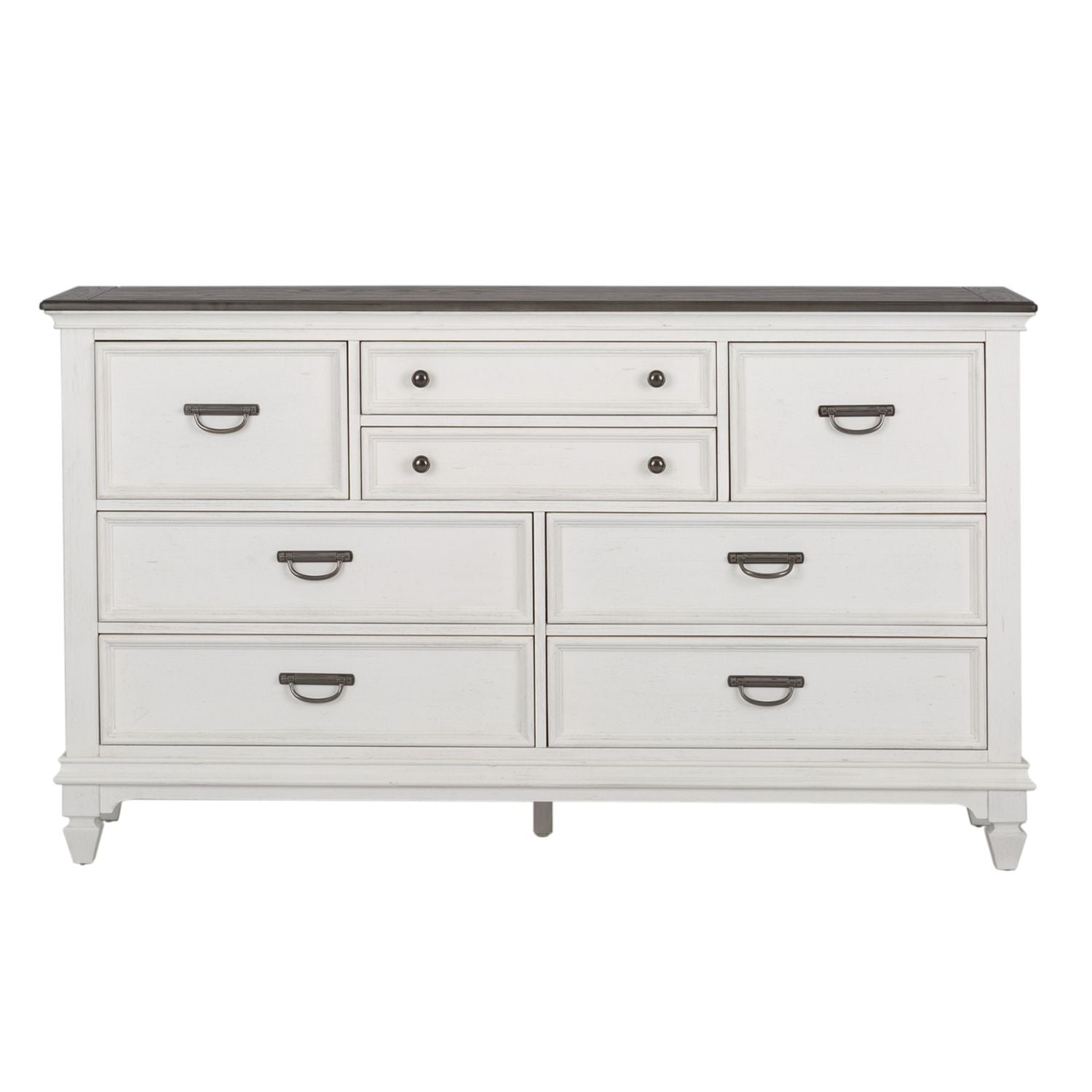 Eight drawer dresser. The two-toned wire brushed white finish with charcoal top adds a taste of vintage, allowing this piece to work from the mountains to an industrial loft. The charcoal top is accented by planks while the white base is highlighted by bead molding and antique pewter hardware.
