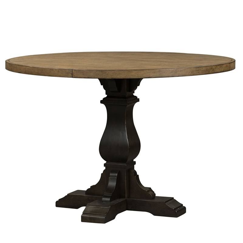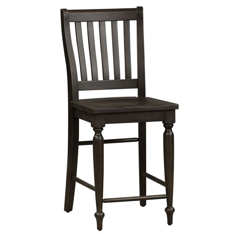 Harvest Home five-piece gathering table set. Crafted of rubberwood solids with knotty white oak veneers, this set features a chalkboard and barley brown finish with saw cut hewing and consists of the gathering table and four slat back counter height chairs. The table has a fixed round planked top that is anchored by a square turned pedestal that flows into corbel accents with shaped bracket feet. The slat back counter height chair features a shaped back and a saddle shaped seat for added comfort.