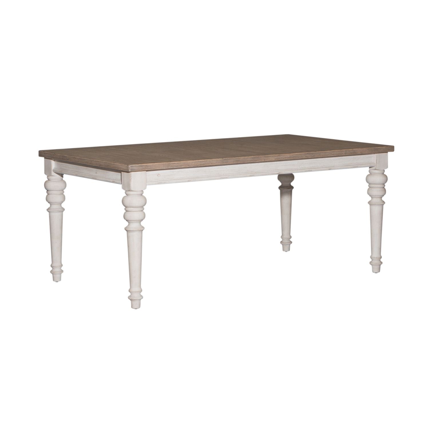 Heartland seven-piece rectangular table set. Crafted of rubberwood solids with cathedral white oak and birch veneers, this set features an antique white finish with a tobacco top and consists of the leg table and six ladder back side chairs. The leg table features a thick square edged planked top that is anchored by heavily turned legs. The ladder back side chairs have a padded upholstered seat in a grey linen chenille fabric with heavy turned front legs.