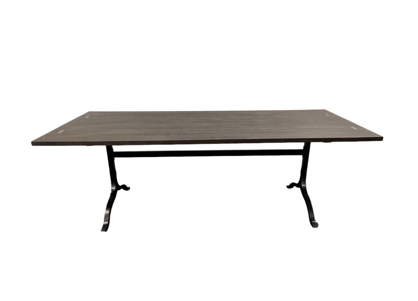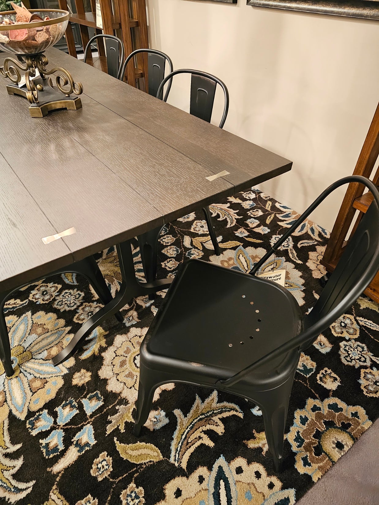 Linden nine-piece Dining Set. Dining Table built with a robust Brownstone-finished top supported by a boldly dynamic stainless steel base and 8 black metal industrial chairs.