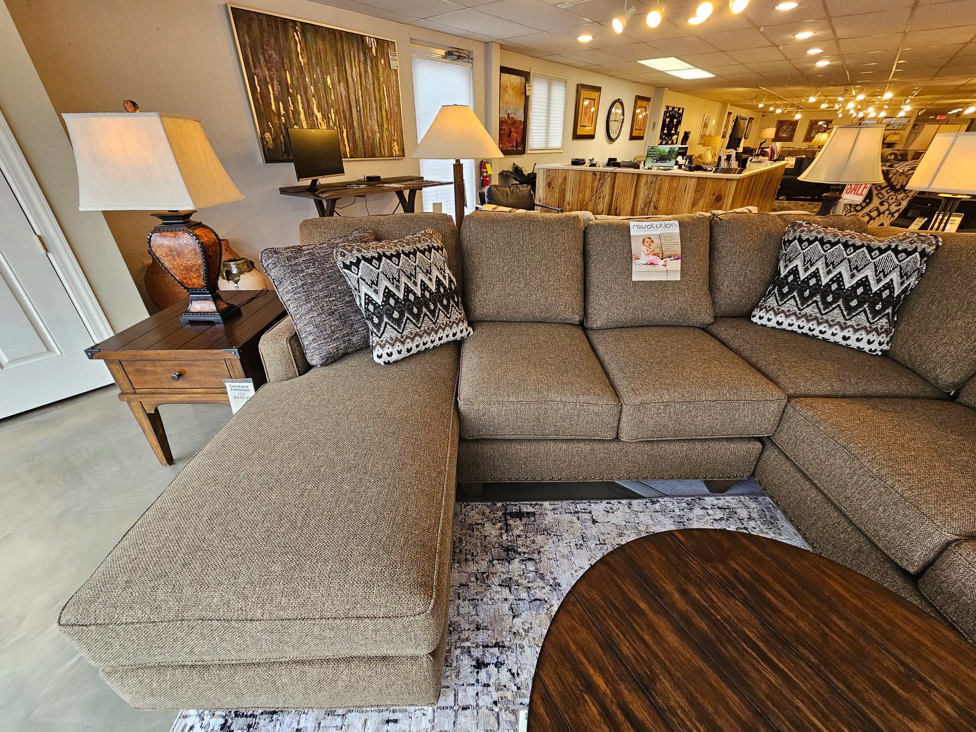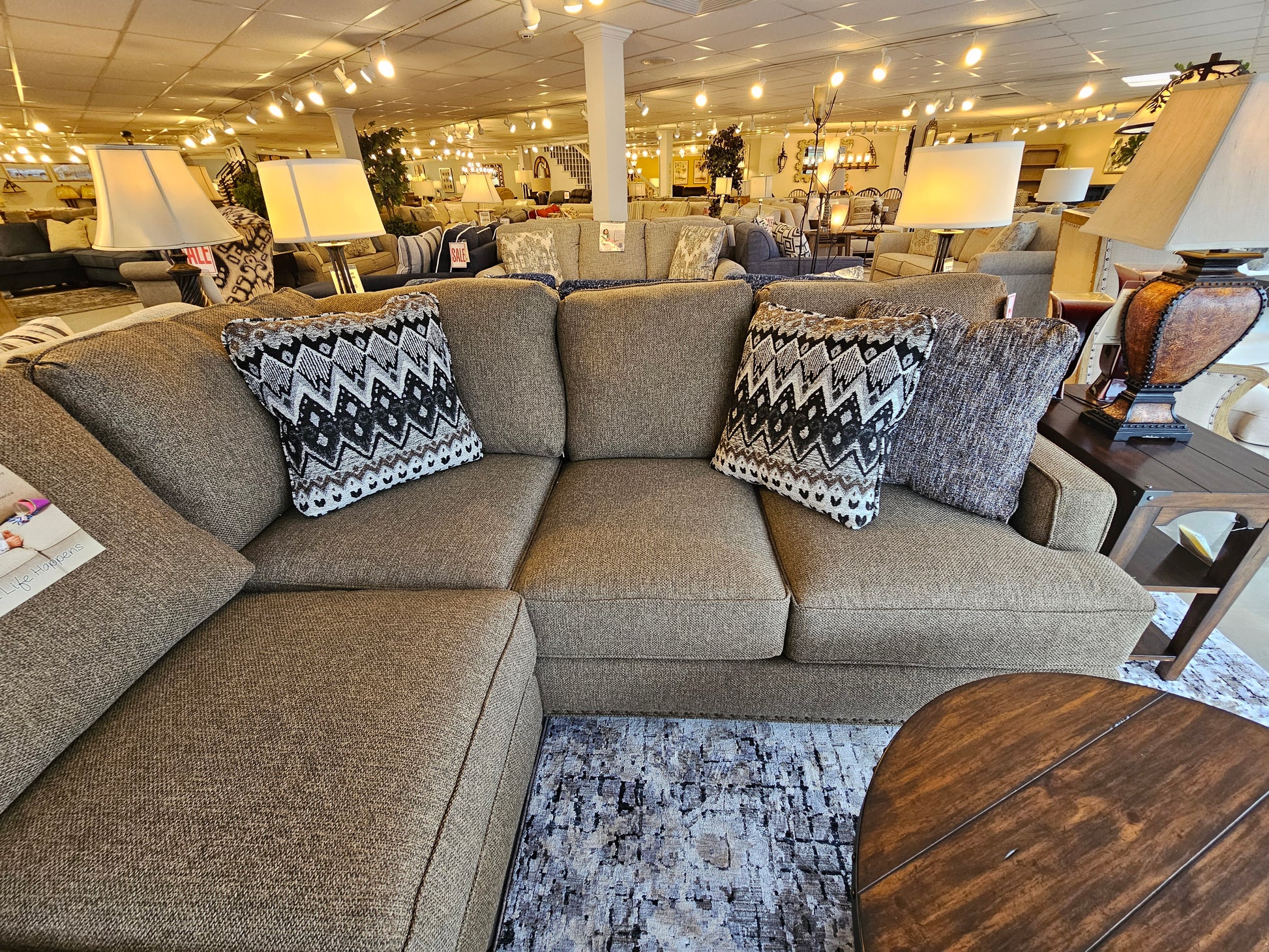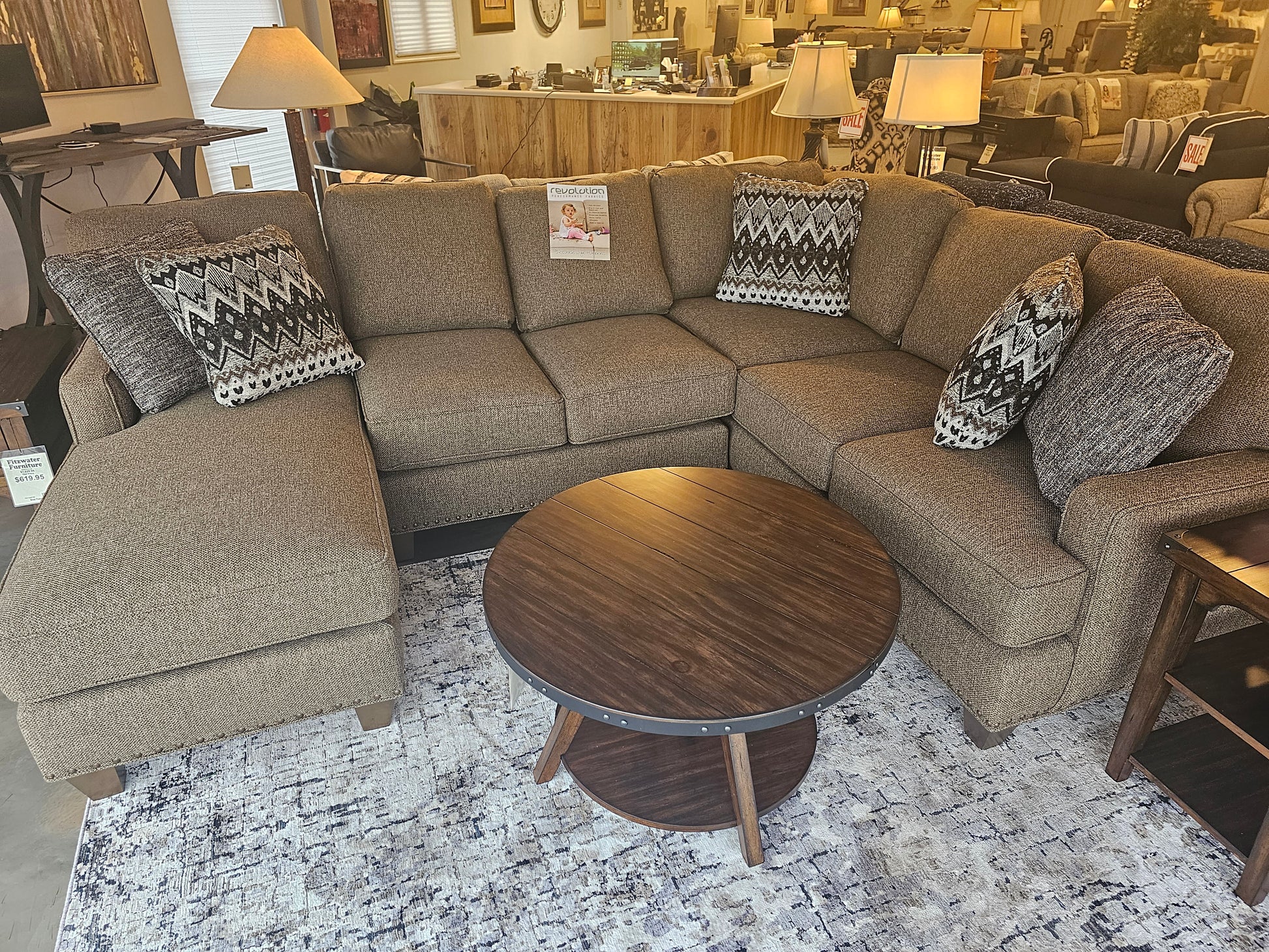 Craftmaster Sectional Sofa. Body Color: Bahama 09 Revolution Fabric with Nail Trim Base with 5 Pillows.