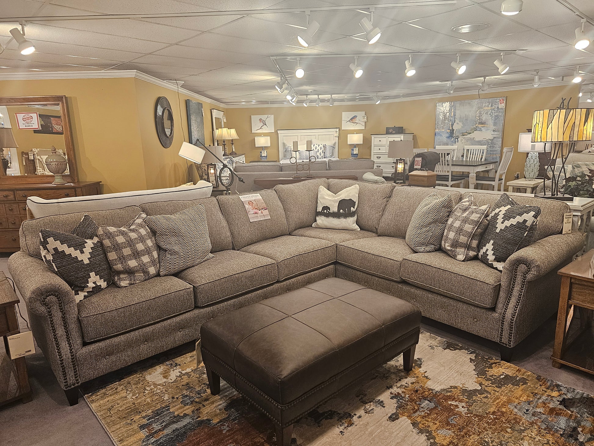 American Heritage Collection by Mayo. Body Color: Boucle Natural with Antique Nail Finish. Includes 7 Down-Filled pillows.