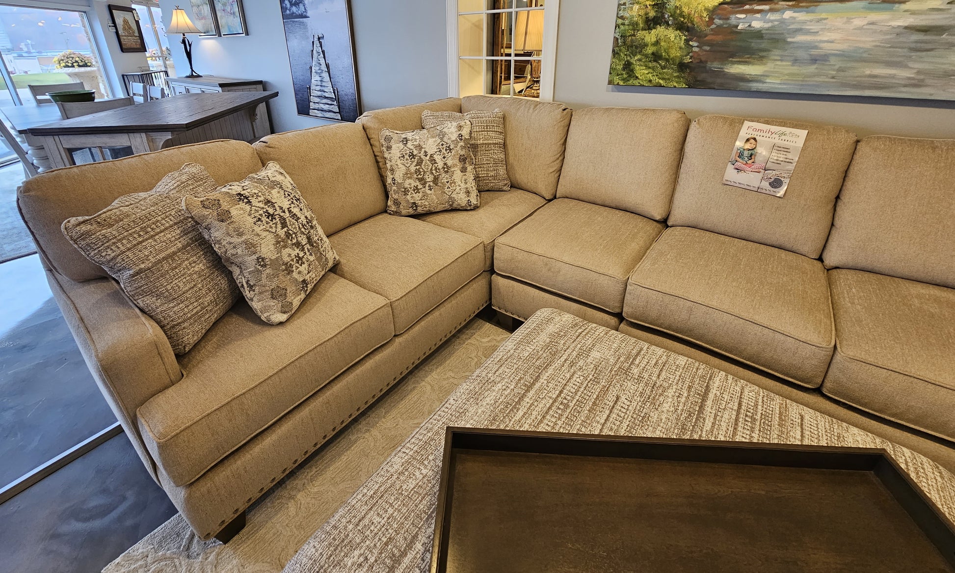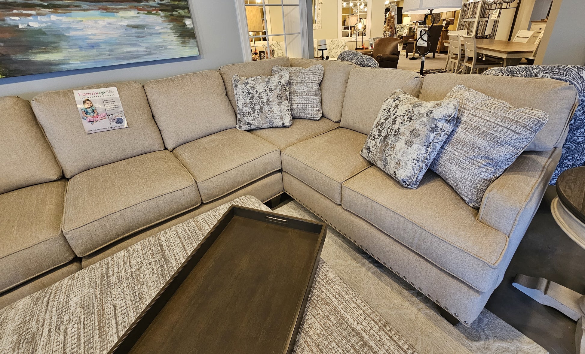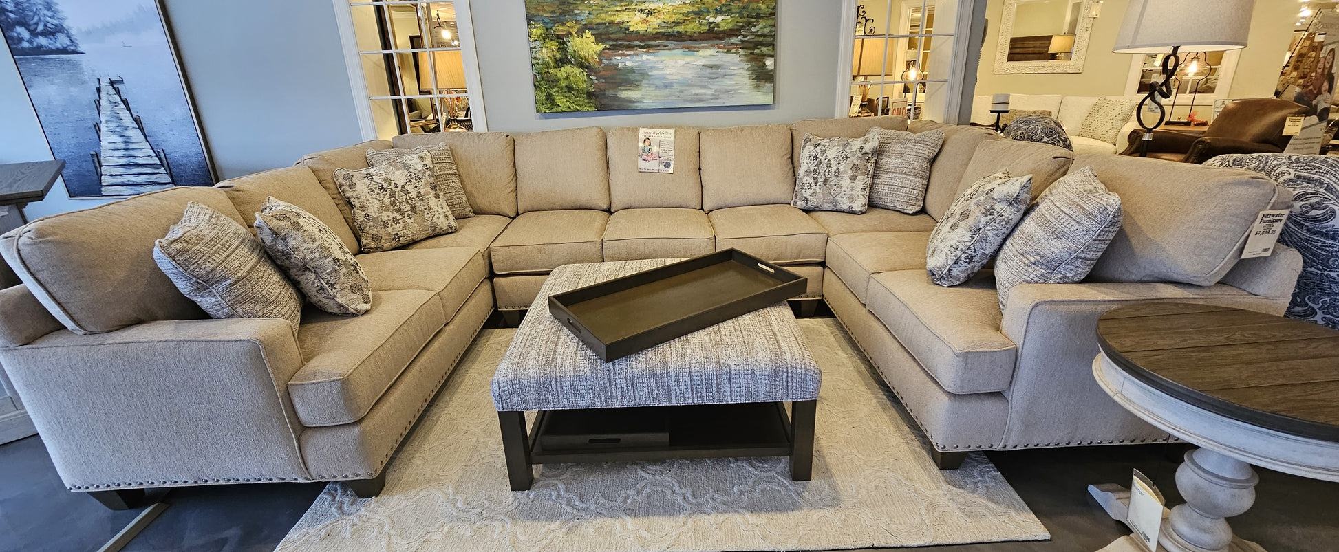 Craftmaster U-Shaped Sectional Sofa with Family Life Fabric. Body Color: Bear Hug 10 with 8 Throw Pillows.