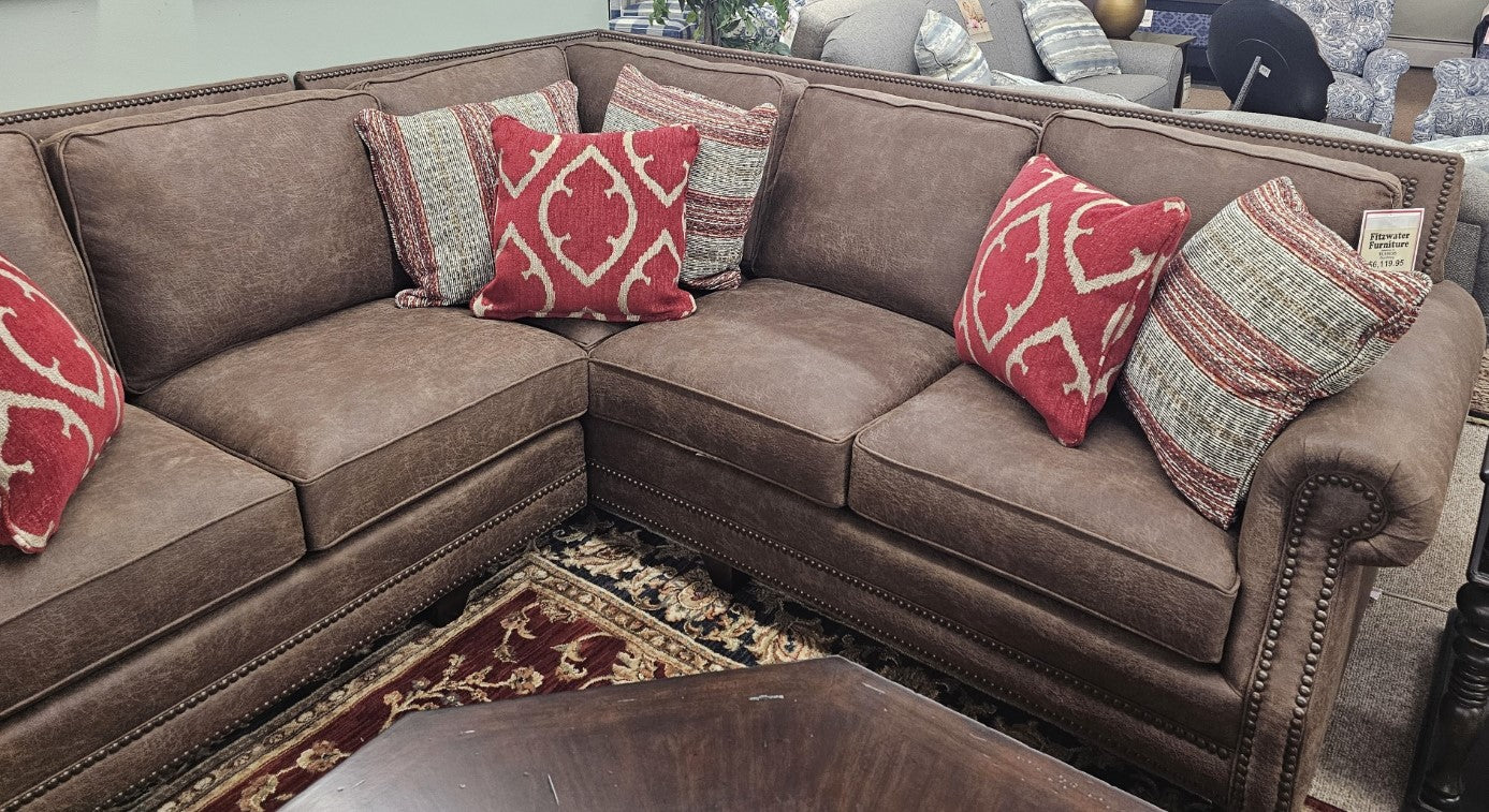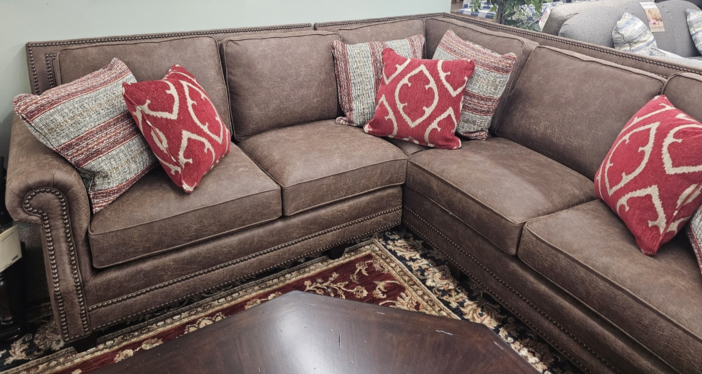 Mayo Sectional in Microfiber. Body Color: Northwest Whiskey with 7 Contrast Pillows.