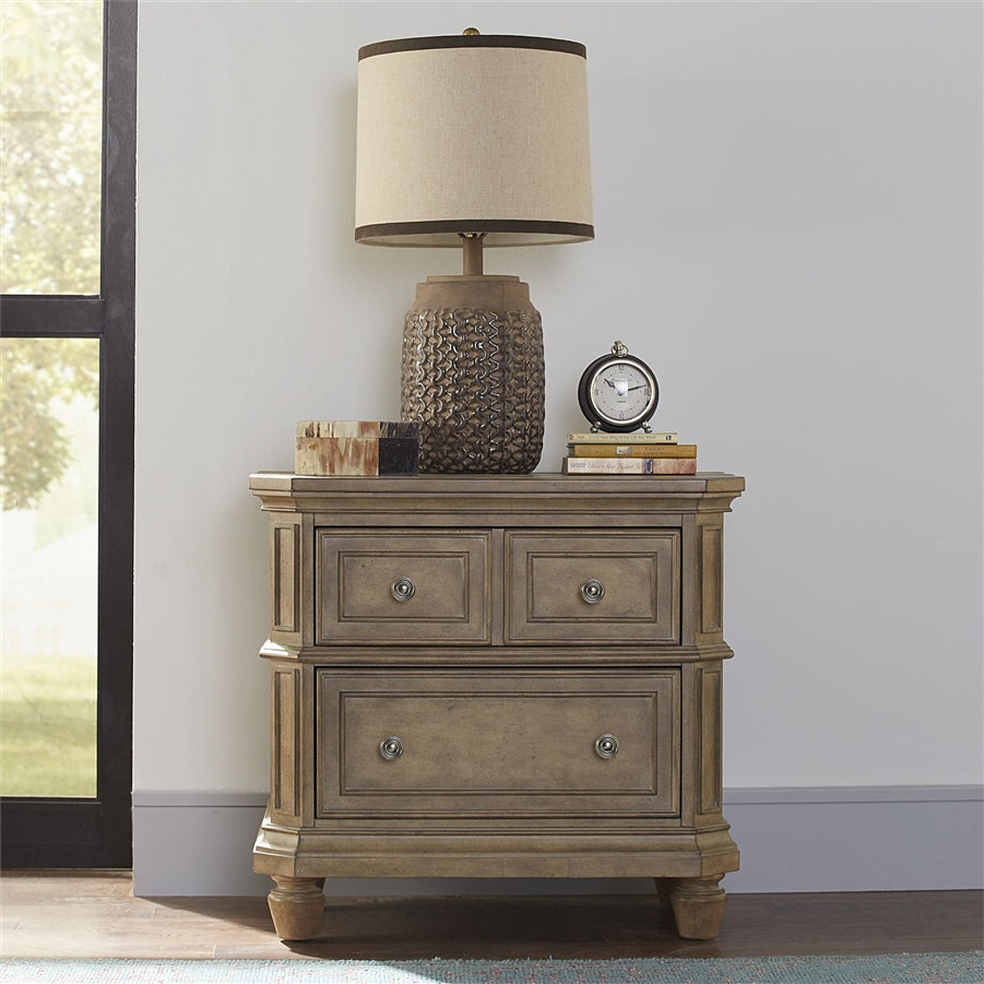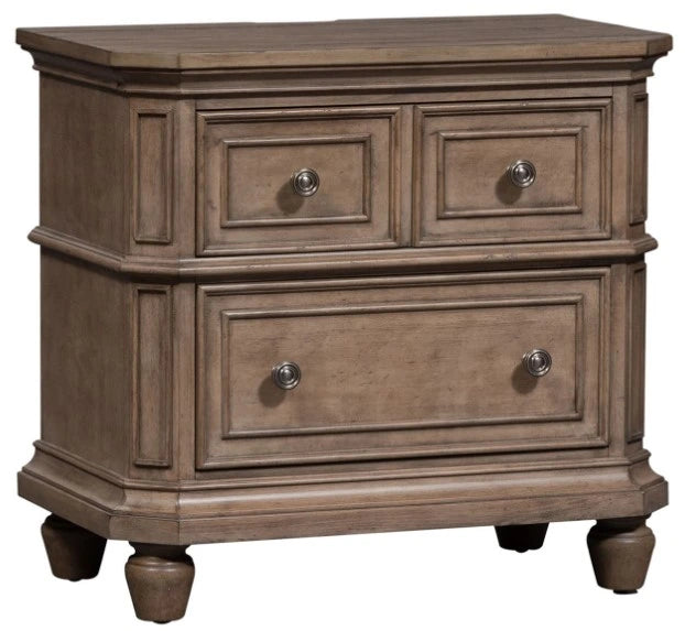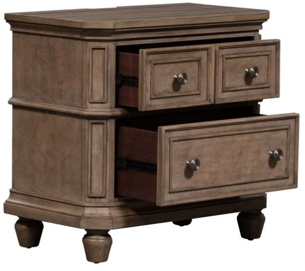 A design that combines for a grand feel of the past with today's luxurious lifestyle. The weathered stone finish creates a worn antique feel with artistic distressing along with grand scale to create a group to be passed to generations. Nightstands feature Charging Station with 2 Outlets and 2 USB Ports.